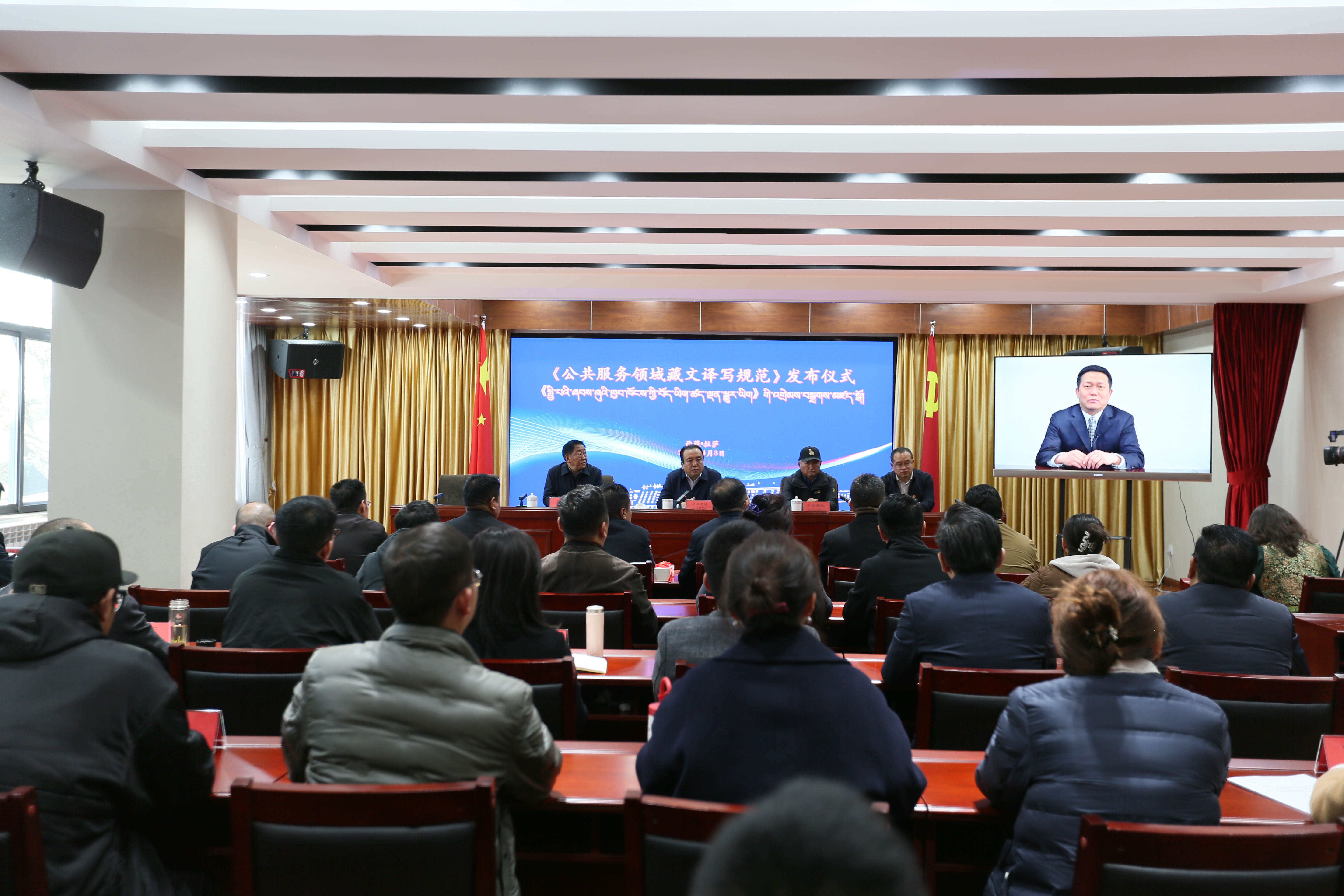 རང་སྐྱོང་ལྗོངས་བོད་སྐད་ཨུད་གཞུང་ལས་ཁང་(རྩོམ་སྒྱུར་ཅུད)གིས<<སྤྱི་པའི་ཞབས་ཞུའི་ཁྱབ་ཁོངས་ཀྱི་བོད་ཡིག་ཚད་ལྡན་སྒྱུར་ཡིག>>དཔེ་དེབ་འགྲེམས་བསྒྲགས་ཚོགས་འདུ་འཚོགས་པ།