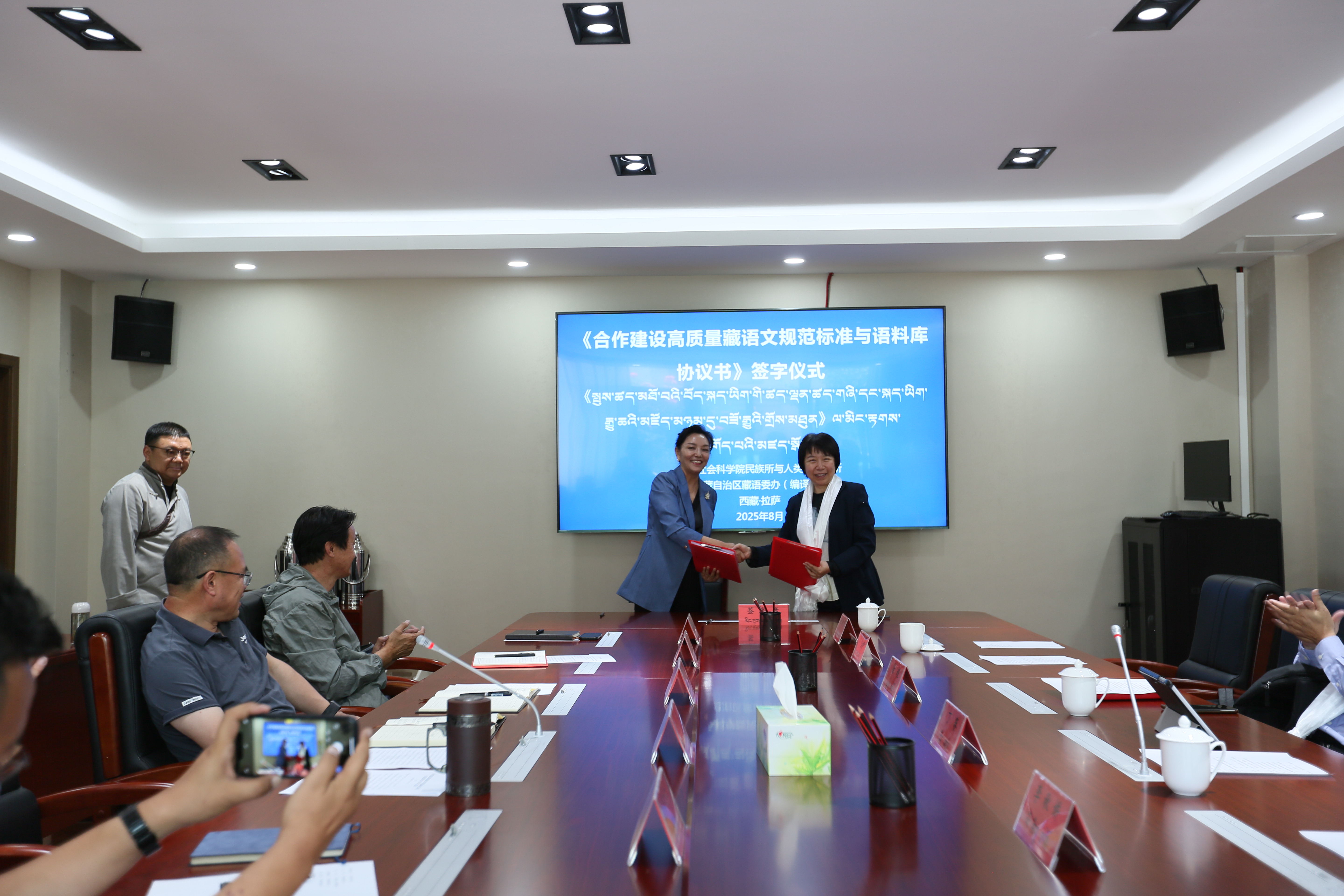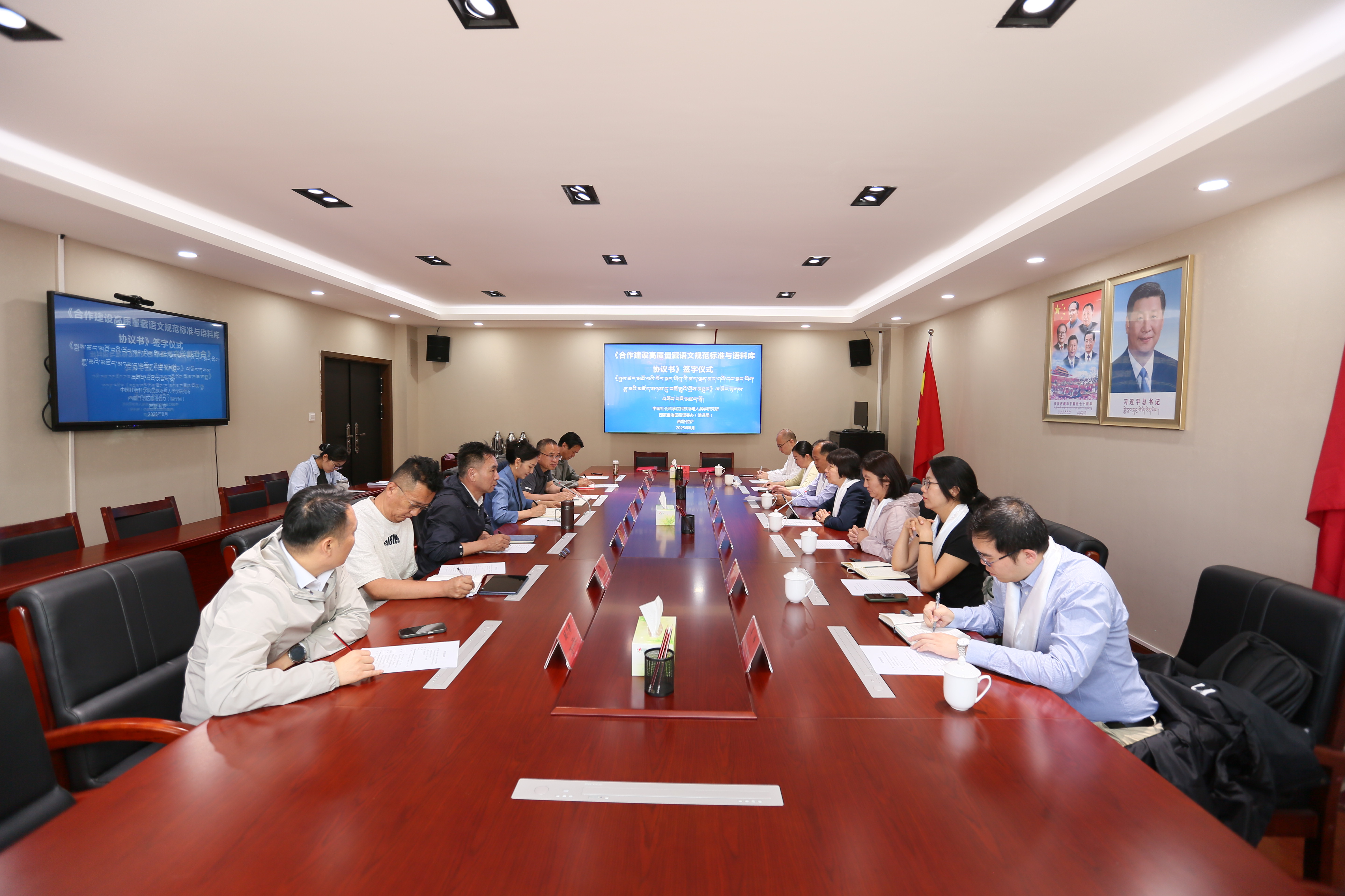 མི་རིགས་ལས་དོན་ལ་ཤུགས་སྣོན་དང་ལེགས་བཅོས་བྱ་རྒྱུའི་སྐོར་དང་། དེ་བཞིན་གྲངས་འཛིན་ཀྲུང་གོ་འཛུགས་སྐྲུན་བྱ་རྒྱུའི་སྐོར་གྱི་སྤྱི་ཁྱབ་ཧྲུའུ་ཅི་ཞི་ཅིན་ཕིང་གི་གལ་ཆེའི་དགོངས་དོན་ལག་བསྟར་དོན་འཁྱོལ་གཏིང་ཟབ་བྱས་ཏེ། དུས་བབ་གསར་པ་དང་། ལས་འགན་གསར་པ། བླང་བྱ་གསར་པ་བཅས་ལ་དམིགས་ནས་ཐུན་མོང་ཐོག་དབང་གྲགས་ཀྱི་རང་བཞིན་དང་། ཕྱོགས་བསྡུས་ཀྱི་རང་བཞིན། དངོས་སྤྱོད་ཀྱི་རང་བཞིན་བཅས་ལྡན་པའི་བོད་ཡིག་སྐད་མཛོད་སྐྲུན་ཆེད། ཟླ་8ཚེས་8ཉིན། རང་སྐྱོང་ལྗོངས་བོད་སྐད་ཨུད་གཞུང་ལས་ཁང་(རྩོམ་སྒྱུར་ཅུད)དང་ཀྲུང་གོ་སྤྱི་ཚོགས་ཚན་རིག་ཁང་མི་རིགས་སུའོ་གཉིས་ཀྱིས<<བོད་སྐད་ཡིག་གི་སྤུས་ཚད་མཐོ་བའི་ཚད་གཞི་དང་སྐད་མཛོད་མཉམ་དུ་བཟོ་རྒྱུའི་གྲོས་མཐུན>>ལ་མིང་རྟགས་འགོད་པའི་མཛད་སྒོ་ལྷ་སར་སྤེལ་བ་རེད།